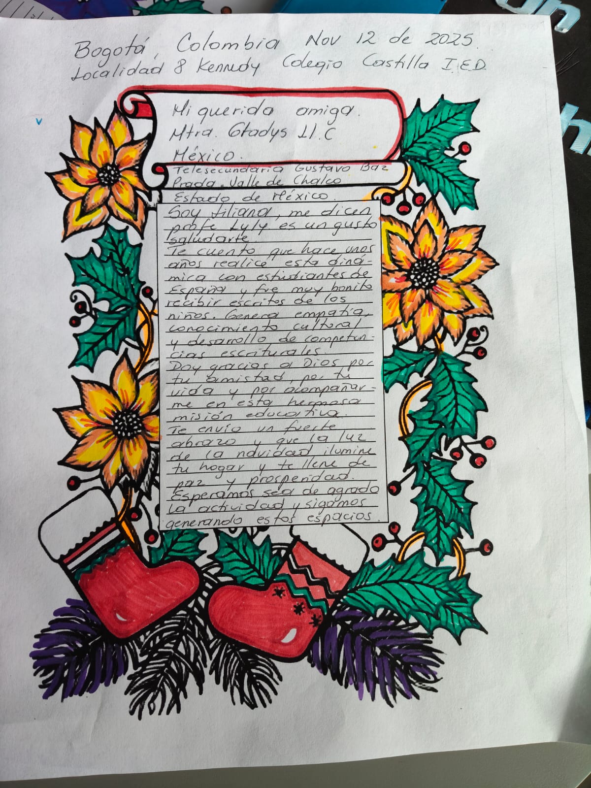 Fortalecer la competencia comunicativa escrita a través del género epistolar(la carta), promoviendo la empatía intercultural y el intercambio de tradiciones navideñas entre estudiantes de México (Telesecundaria Gustavo Baz Prada Valle de Chalco y Colombia Colegio Castilla IED).