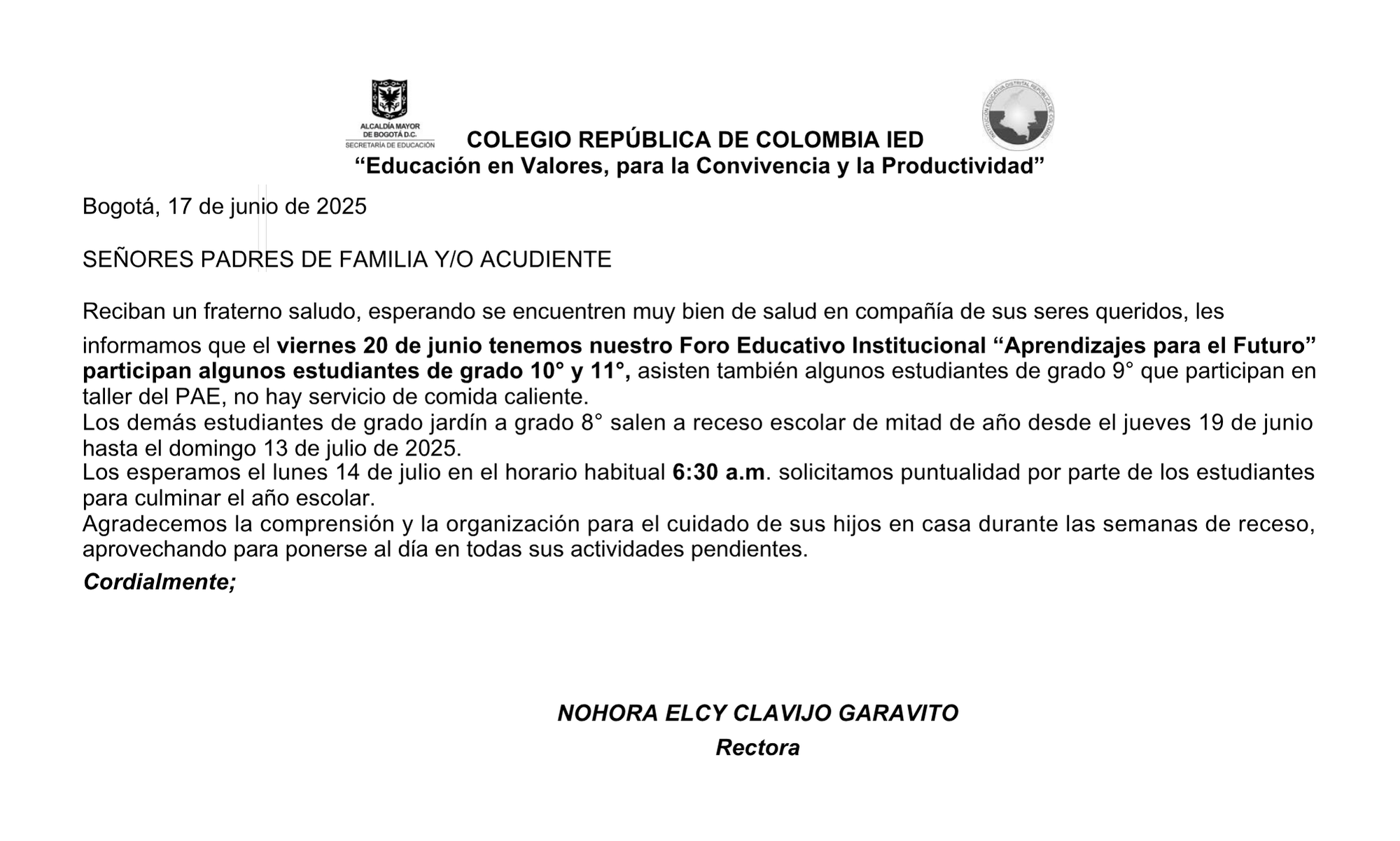 CIRCULAR: Foro Educativo Institucional y receso escolar de mitad de año COLEGIO REPUBLICA DE COLOMBIA (IED) Enviado por Cilia Patricia… el 18/06/2025