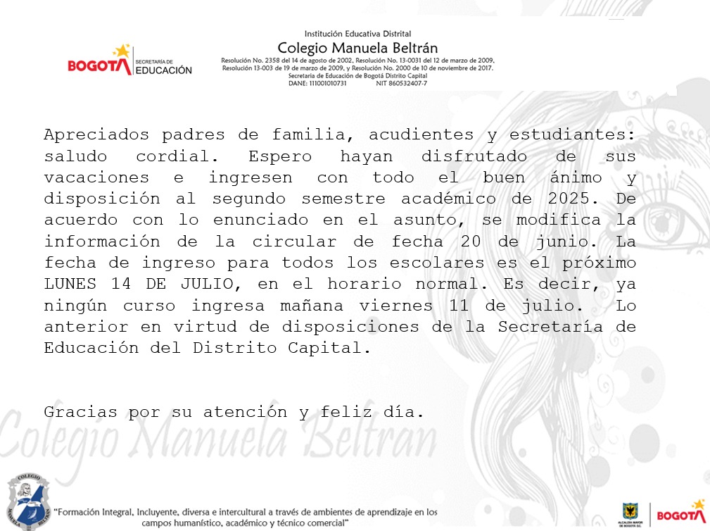 Fecha de ingreso para el segundo semestre académico: lunes 14 de julio, en el horario normal.