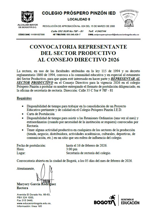 CONVOCATORIA SECTOR PRODUCTIVO Enviado por Luis Fernando … el 09/02/2026 .CONVOCATORIA SECTOR PRODUCTIVOCordialmente invitados a ser parte del Gobierno Escolar Prosperista. Ingresa a link para detalles de su participación