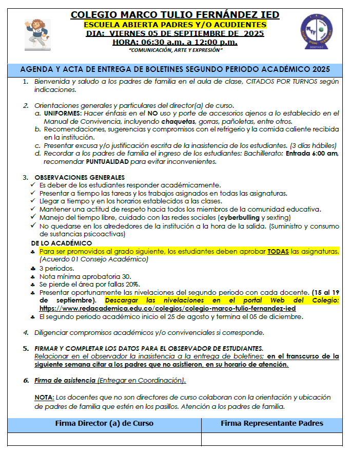 Entrega de informes académicos COLEGIO MARCO TULIO FERNANDEZ (IED) Enviado por Diana Marcela … el 04/09/2025