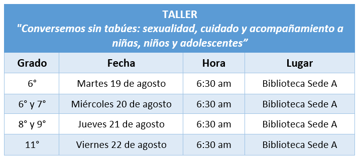 El taller con el que se iniciará la estrategia se denomina "Conversemos sin tabúes: sexualidad, cuidado y acompañamiento a niñas, niños y adolescentes”. A continuación se encuentran unos botones azules donde, la hacer clic en cada uno, se puede ver la circular con la información correspondiente por grado según la siguiente programación: