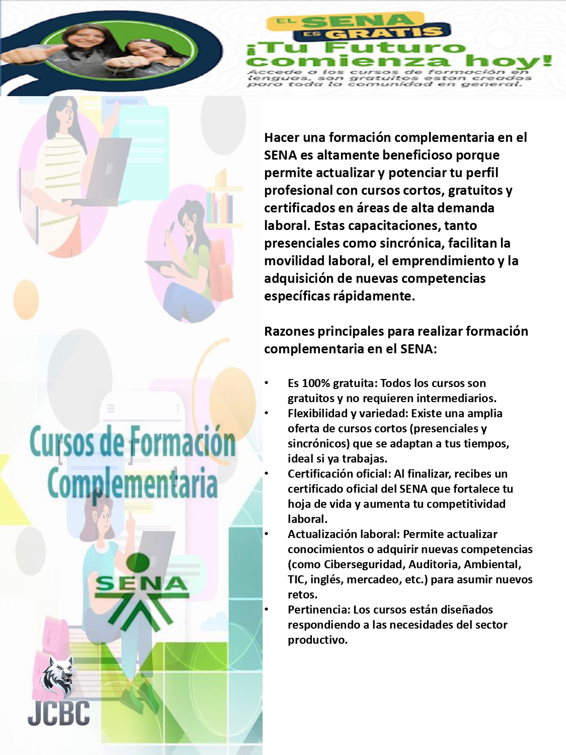 La formación complementaria del SENA se caracteriza por ser de corta duración y enfocada en el desarrollo de habilidades específicas que fortalecen la empleabilidad, productividad y apropiación tecnológica de los participantes .