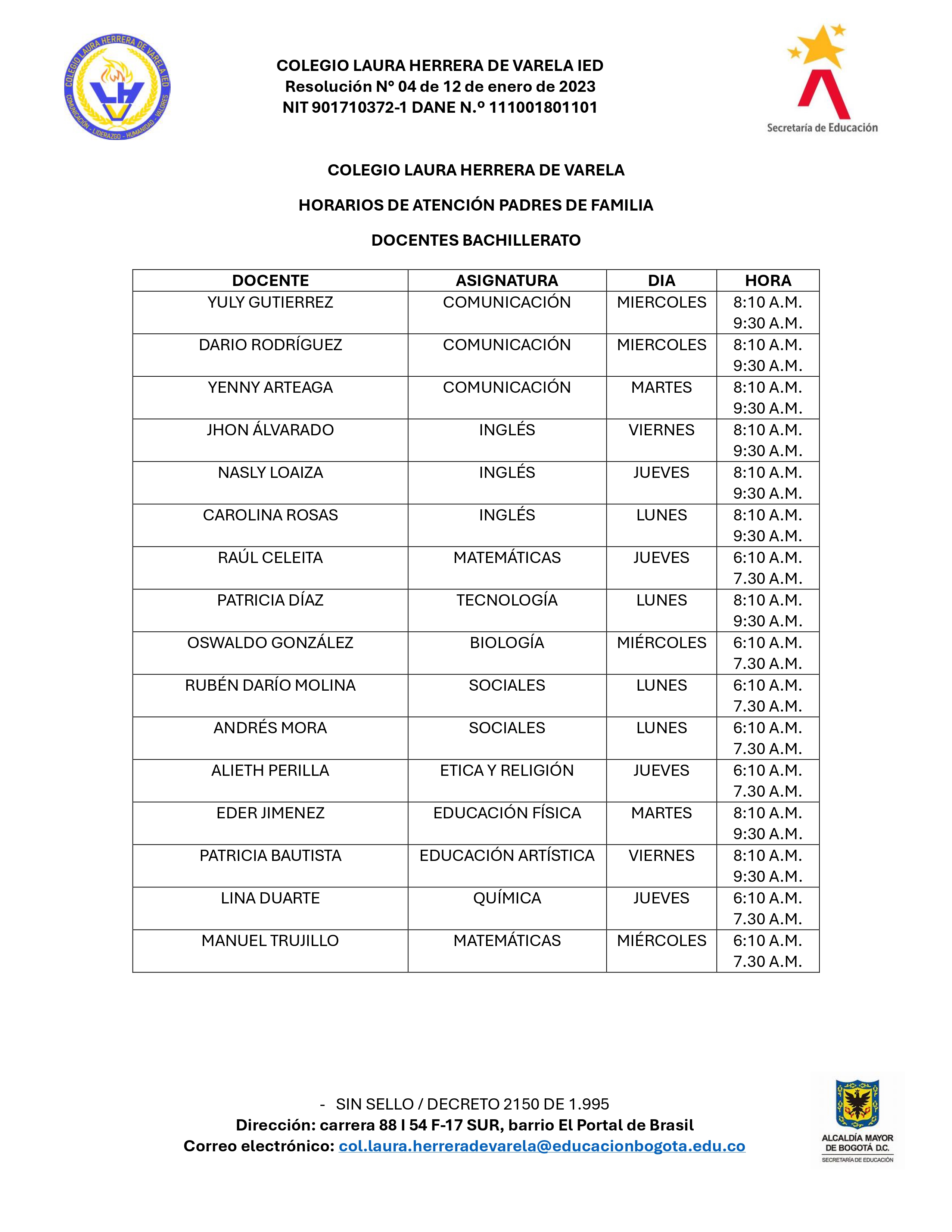 HORARIO DE ATENCIÓN A PADRES DE FAMILIA JORNADA MAÑANA COLEGIO LAURA HERRERA DE VARELA IED Enviado por Ana Patricia D… el 31/03/2025