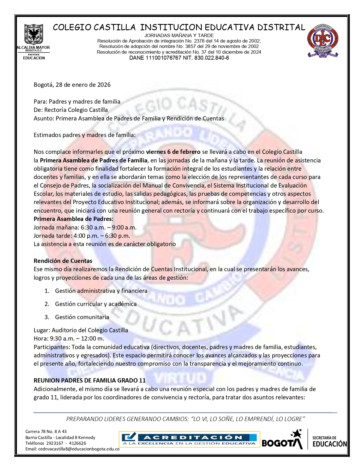 Primera Asamblea de Padres de Familia y Rendición de Cuentas Colegio Castilla (IED) Enviado por Edwin German R… el 28/01/2026