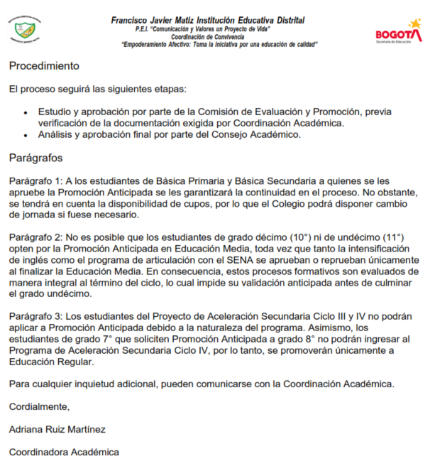 Proceso de promoción anticipada 2026 (únicamente para estudiantes de primero a noveno grados). COLEGIO FRANCISCO JAVIER MATIZ (IED) Enviado por Adriana Alexan… el 28/02/2026