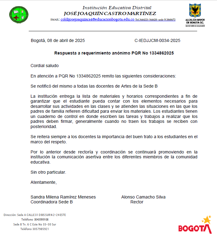 Respuesta a requerimiento anónimo PQR No 1334862025 Colegio Jose Joaquin Castro Martinez (IED) Enviado por Luz Mary Benít… el 11/04/2025