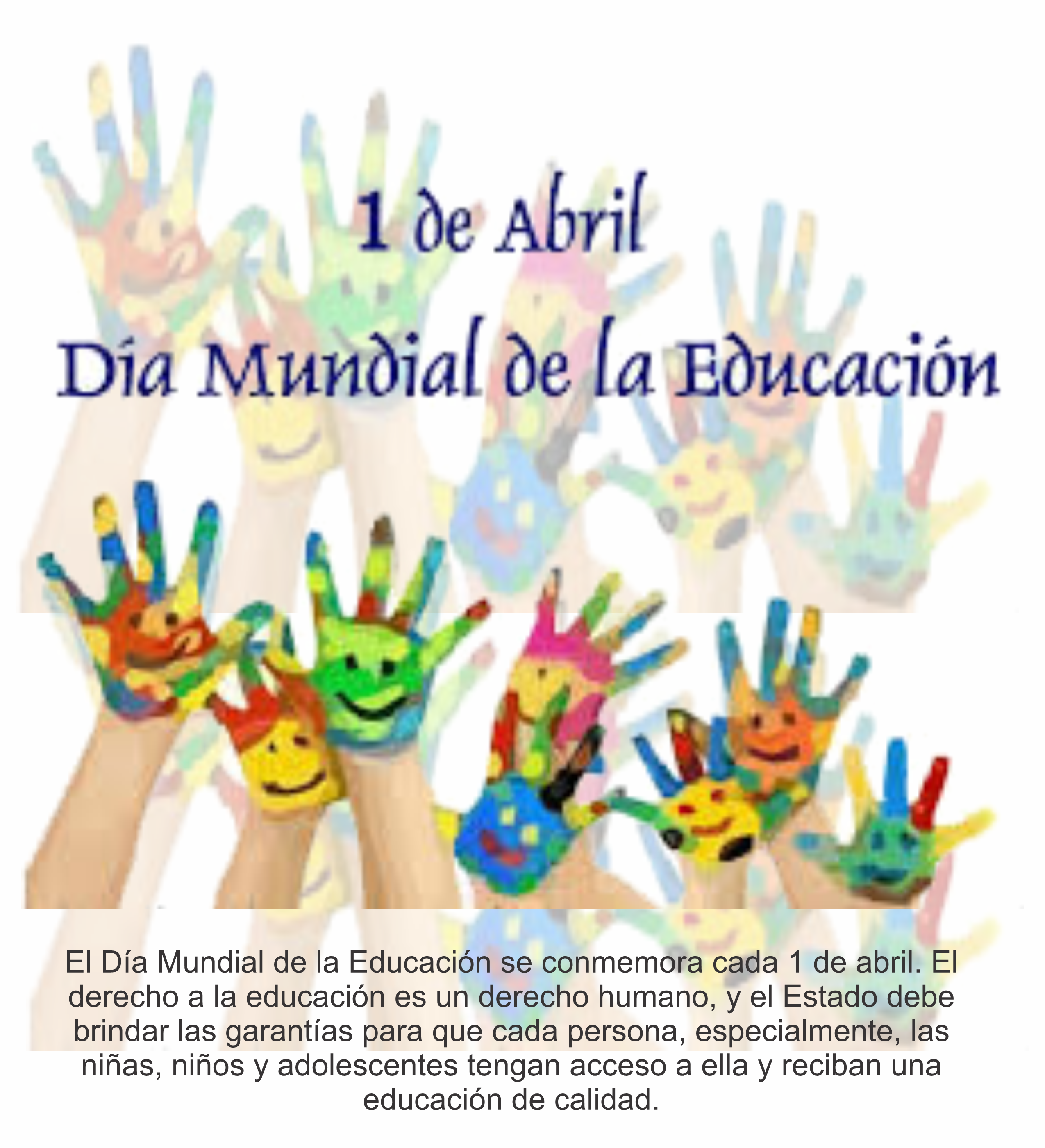 El Día Mundial de la Educación se conmemora cada 1 de abril. El derecho a la educación es un derecho humano, y el Estado debe brindar las garantías para que cada persona, especialmente, las niñas, niños y adolescentes tengan acceso a ella y reciban una educación de calidad