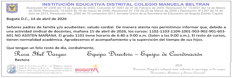 ACTIVIDADES MES DE ABRIL COLEGIO MANUELA BELTRAN (IED) Enviado por Gladis Beatriz… el 24/03/2026 Abril Viernes 17/2026. Hay Normalidad Académica. Así nos comunicamos