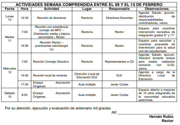 Nuevamente Inicio la presente agenda con un sentido saludo de agradecimiento a otra persona, que ejecuto trabajo directivo en el Colegio Técnico Palermo IED y que hasta el día de hoy lunes 09 de enero nos acompañará. En nombre de la comunidad educativa del Colegio Técnico Palermo IED, todos los agradecimientos por tantos años de gestión directiva desde la coordinación a la Dra. Nancy Martínez nuestros mejores deseos para esta nueva etapa en su nueva ubicación. Buen viento y buena mar compañera. También ha sido relevada la docente provisional Sonia, quien venida desempeñándose como apoyo en la orientación de la asignatura ambiental en el nivel básica primaria, agradecimientos por el trabajo realizado en su paso por nuestra institución.
