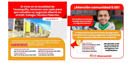 4. Instituto de Lenguas de la Universidad Distrital Francisco José de Caldas ILUD. Reitero la invitación a los cursos que el instituto imparte en las instalaciones del colegio y comparto pieza comunicativa en la que se socializa la información completa, las inscripciones para el segundo bimestre se activaran a mediados del semestre, entre tanto se puede solicitar información en los contactos socializados en las piezas comunicativas.