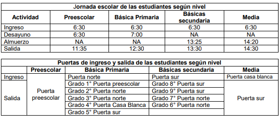El día lunes a la primera unidad de clase se socializarán con las estudiantes los horarios de trabajo académico semanal que regirán hasta nueva organización. Solicito a las docentes asiganadas a la primera unidad socializar dichos horarios, estos serán distribuidos por el coordinador Carlos Ceballos. Por otro lado, atendiendo al comunicado emitido por rectoría solicito a todos los funcionarios del colegio garantizar la garantía de derechos de NNA en las determinaciones que se tomen en la escuela.