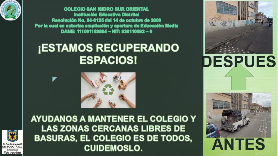 AYUDANOS A MANTENER EL COLEGIO LIMPIO Colegio San Isidro Sur Oriental (IED) Enviado por Benjamin Plini… el 17/07/2025