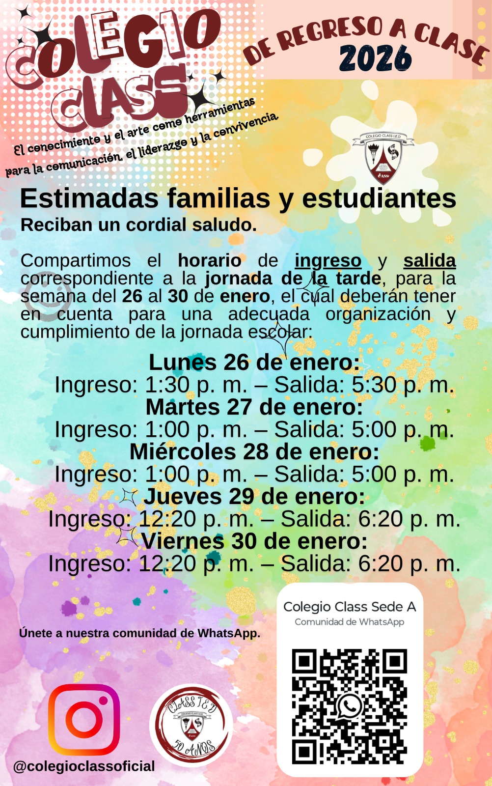 Damos inicio al año 2026 con mucha emoción. Agradecemos el apoyo recibido por la comunidad educativa el año pasado y esperamos seguir contando con su compromiso para este nuevo año. Nuestros estudiantes ingresan este lunes 26 de enero y durante la semana los horarios, para la sede A, serán los siguientes: