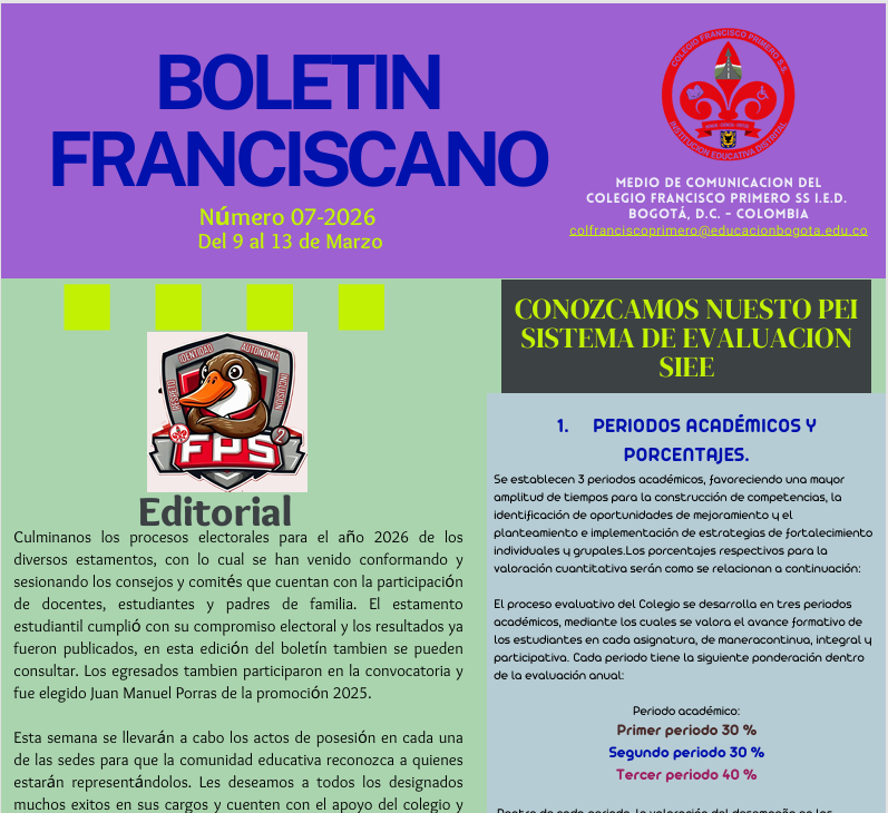 Boletin 7 COLEGIO FRANCISCO PRIMERO S.S. (IED) Enviado por Ruby Marcela T… el 21/02/2026 Compartimos nuestro Boletin semanal. Boletin 7
