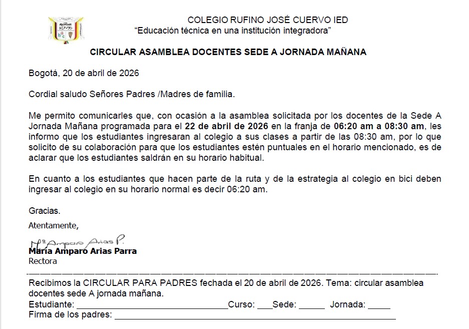 CIRCULAR ASAMBLEA DOCENTES SEDE A JORNADA MAÑANA COLEGIO RUFINO JOSE CUERVO (IED) Enviado por María Amparo A… el 20/04/2026