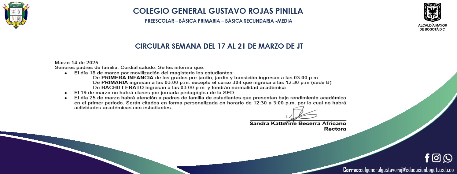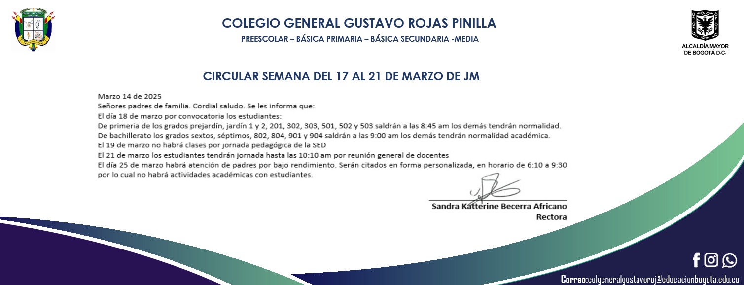 CIRCULAR DEL 17 AL 21 DE MARZO Colegio General Gustavo Rojas Pinilla (IED) Enviado por Carlos Mario C… el 14/03/2025 JORNADA MAÑANA JORNADA TARDE CordialmenteSANDRA KATTERINE BECERRA AFRICANORectora