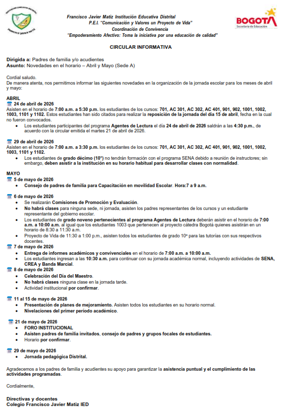 CIRCULAR INFORMATIVA Dirigida a: Padres de familia y/o acudientes Asunto: Novedades en el horario – Abril y Mayo (Sede A)