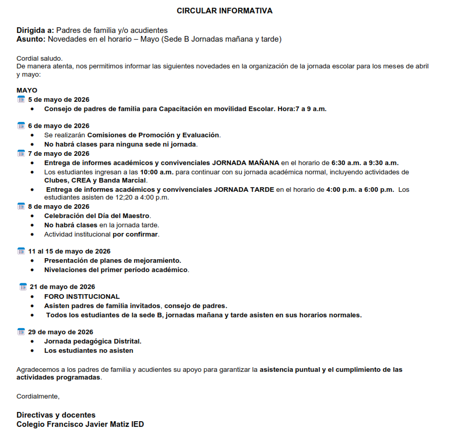 CIRCULAR INFORMATIVA Dirigida a: Padres de familia y/o acudientes Asunto: Novedades en el horario – Mayo (Sede B Jornadas mañana y tarde) COLEGIO FRANCISCO JAVIER MATIZ (IED) Enviado por Adriana Alexan… el 22/04/2026 Descargar comunicado