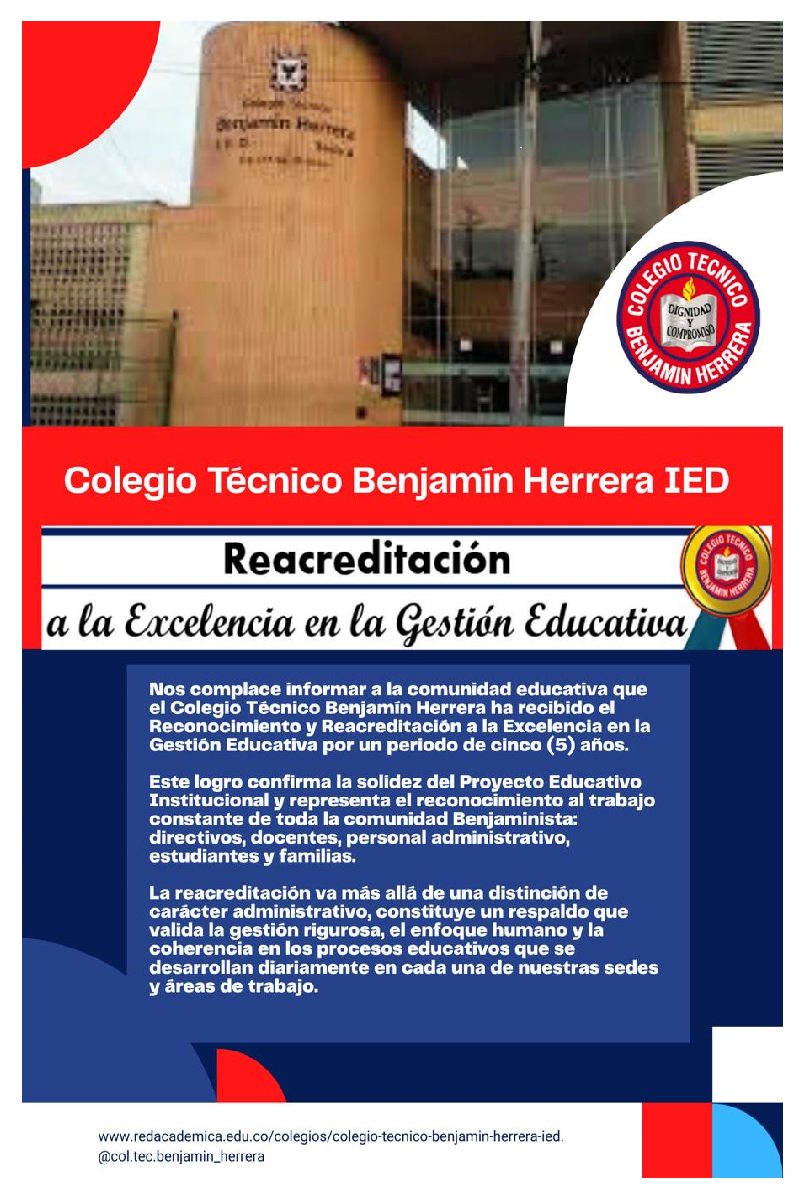 El Colegio Técnico Benjamín Herrera es una Institución Educativa Distrital de carácter oficial y mixto, acreditada en Alta Calidad Educativa por la Secretaría de Educación del Distrito. Está ubicado en el barrio Alcalá, localidad de Puente Aranda, y cuenta con tres sedes organizadas para atender de manera articulada los niveles de preescolar, básica y media técnica. Las sedes B y C atienden los ciclos iniciales y de primaria, mientras que la Sede A concentra la básica secundaria y la media técnica, en articulación con el SENA, en tres programas de alta pertinencia: Diseño Arquitectónico, Instalaciones Eléctricas Residenciales y Biotecnología con énfasis en Agroindustria Alimentaria. Esta estructura permite ofrecer una doble titulación que fortalece la formación técnica, sin descuidar el desarrollo académico, ético y ciudadano de los estudiantes.