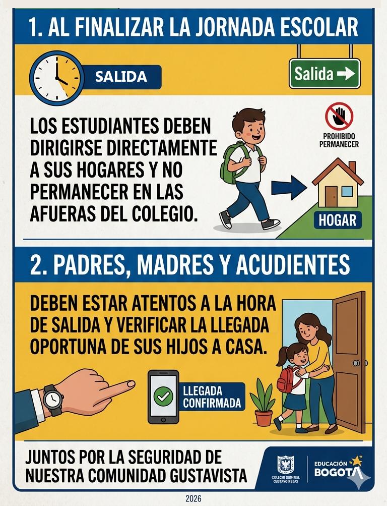 * Al finalizar la jornada escolar, los estudiantes deben dirigirse directamente a sus hogares y no permanecer en las afueras del colegio.