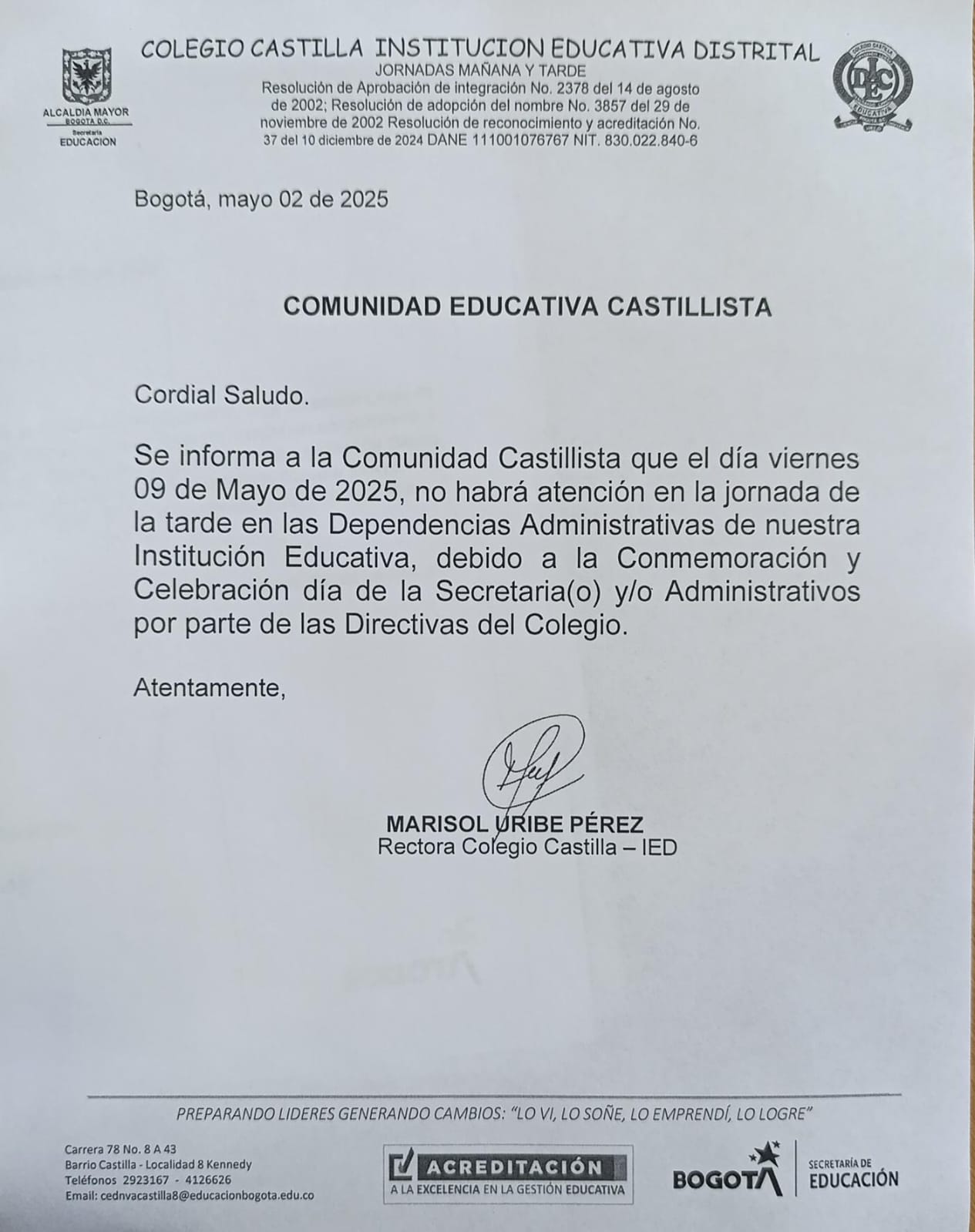 Se informa a la comunidad Castillista que el día viernes 9 de mayo de 2025, no habrá atención en la jornada de la tarde en las dependencias administrativas de nuestra institución Educativa, debido a la conmemoración y celebración del día del secretario(a) y/o administrativos por parte de las Directivas del colegio.