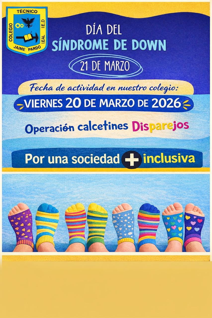 Conmemoración día mundial síndrome de down COLEGIO TECNICO JAIME PARDO LEAL (IED) Enviado por Karina Córdoba… el 11/03/2026 El 20 de marzo se invia a ponerse medias disparejas para lucirlas en el colegio.