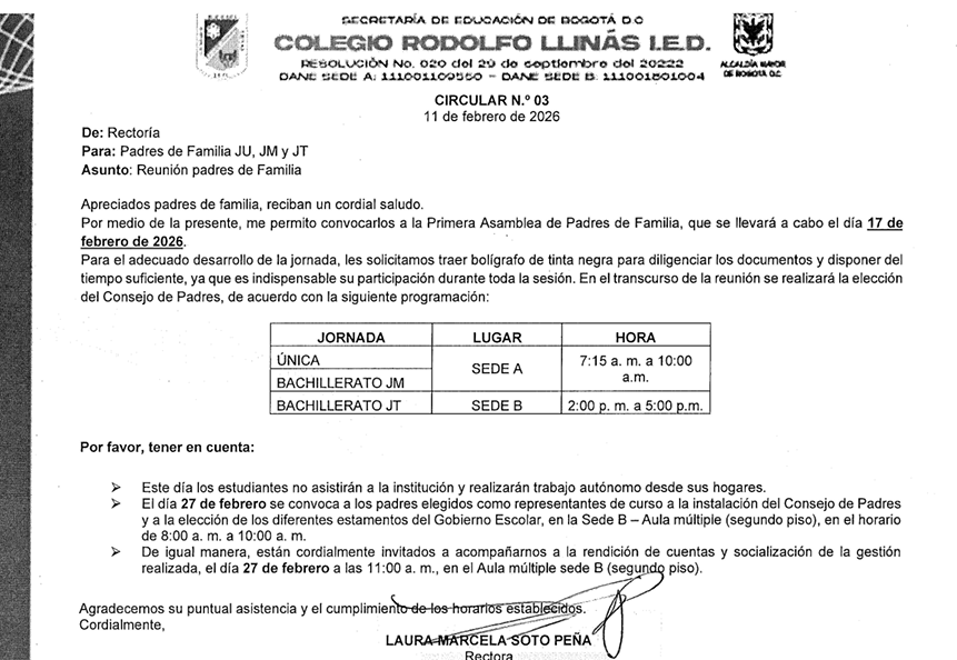 Consulte aquí los comunicados que el colegio publica periodicamente COLEGIO RODOLFO LLINÁS I.E.D. Enviado por Javier Gómez R… el 05/05/2025 Circular N° 3 - Primera Asamblea de padres 2026 Circular informativa JM, JU y JT Noviembre 7 de 2025 Circular N° 41 - septiembre 25 de 2025 Circular informativa: Jornada pedagógica distrital Circular: TALLER DE PADRES VIRTTUAL Circular N° 38 - agosto 28 de 2025 Circular informativa del 30 de julio Circular 31 de julio 24 Circular 29 - Julio 10 de 2025 Circular N° 28 - de junio 20 de 2025 Circular N° 27 - Junio 5 de 2025 Circular N° 26 - mayo 27 de 2025 Circular N° 24 - mayo 12 de 2025 Circular N° 21 - abril 24 de 2025