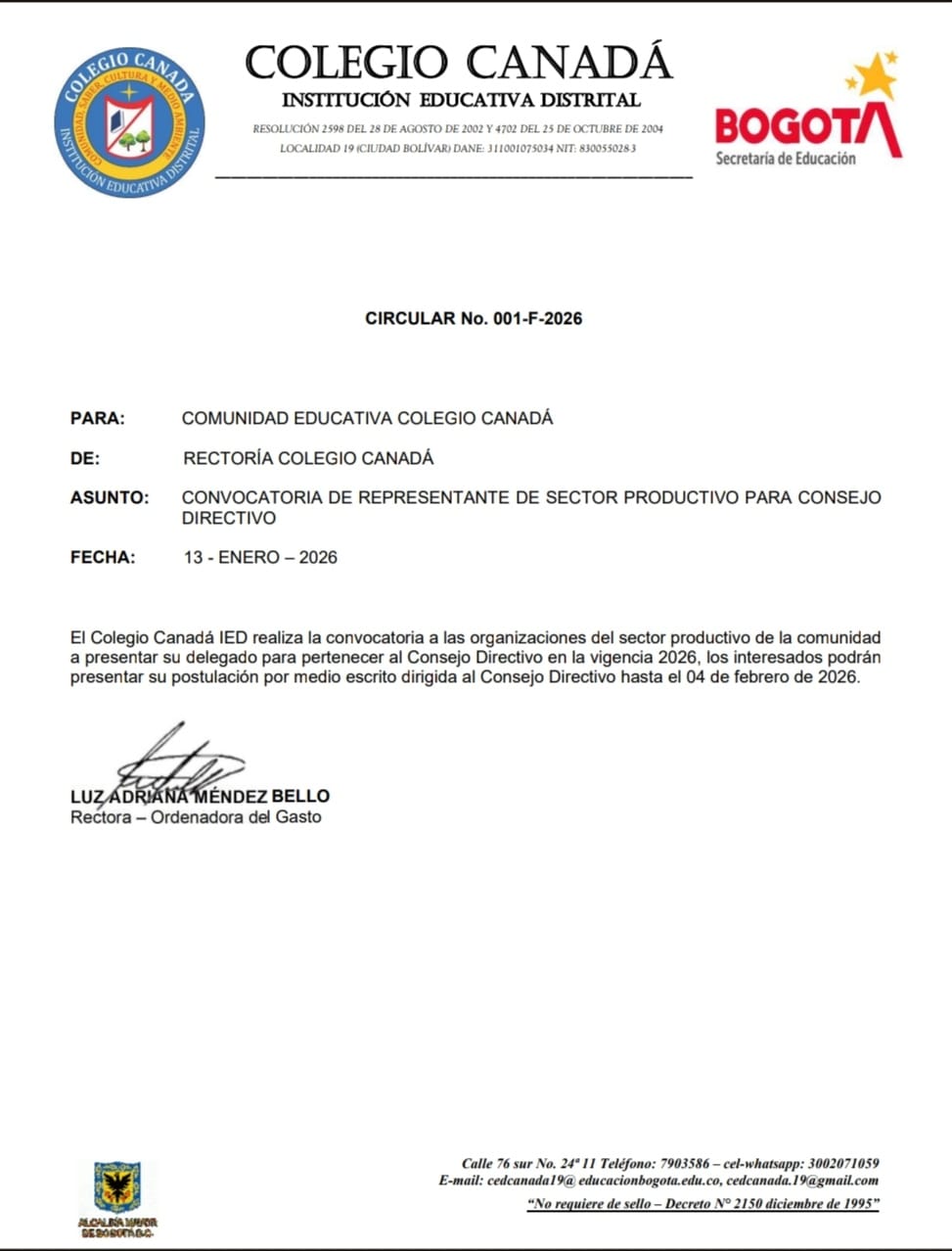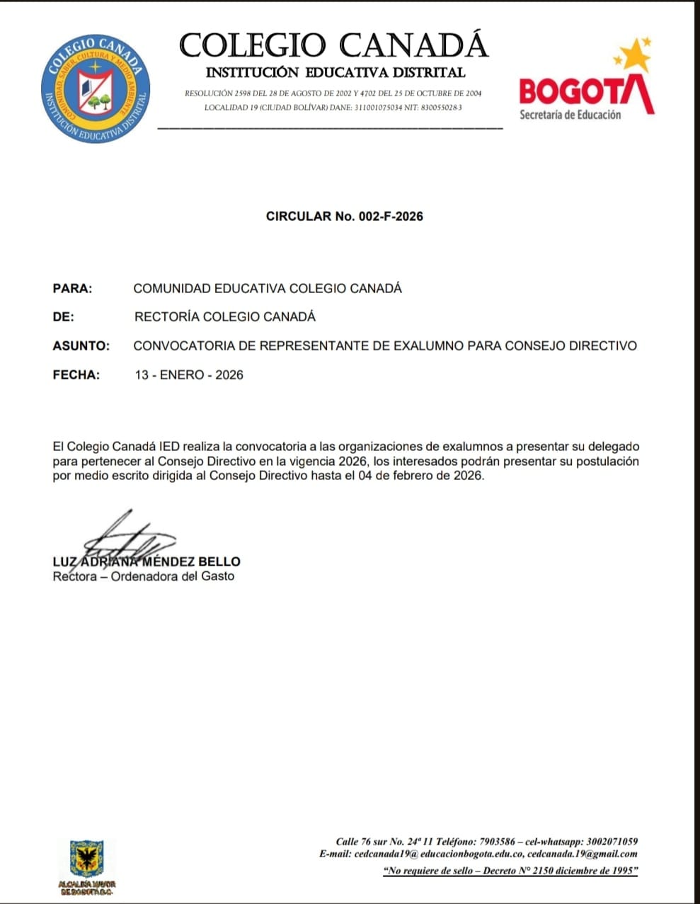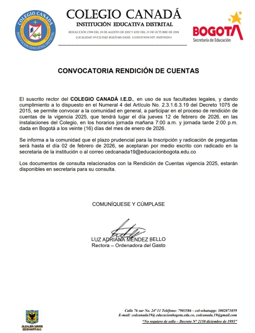 Convocatoria Rendición de Cuentas Colegio Canadá (IED) Enviado por Jeniffer Paola… el 22/01/2026 Convocatotia Rendicón de Cuentas