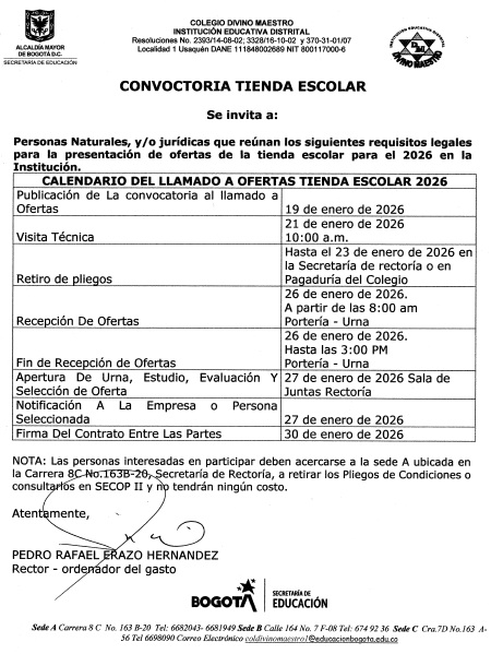 Convocatoria Tienda Escolar Colegio Divino Maestro IED Enviado por Nohora Astrid … el 20/01/2026 Convocatoria Tienda Escolar