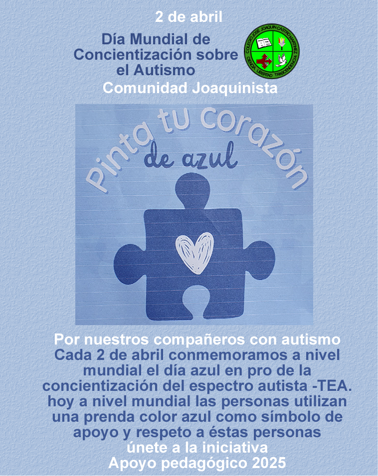 Día Mundial del autismo Colegio Jose Joaquin Castro Martinez (IED) Enviado por Luz Mary Benít… el 02/04/2025 Audio file Iniciativa del Docente de apoyo pedagógico Oscar Piracún, quien nos invita a reflexionar sobre el autismo.