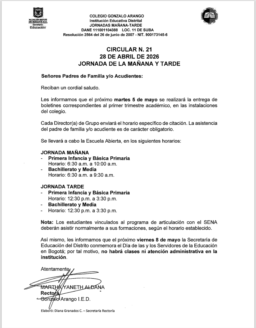 Entrega de boletines primer trimestre Colegio Gonzalo Arango (IED) Enviado por Andrés David R… el 28/04/2026