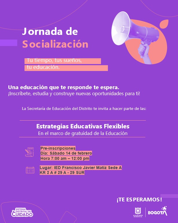 Desde la Manzana del Cuidado de 20 de julio y la Secretaria Distrital de Educación, tenemos el gusto de invitarles a participar de la jornada de matrícula y recepción de documentos para la Estrategia de Educación Flexible.