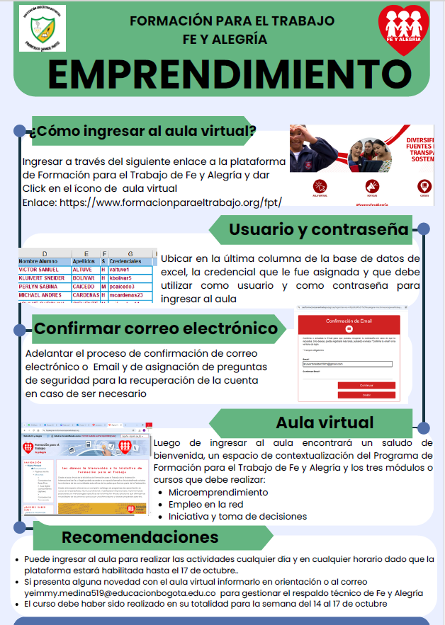 FORMACIÓN PARA EL TRABAJO FE Y ALEGRÍA grado 11 COLEGIO FRANCISCO JAVIER MATIZ (IED) Enviado por Adriana Alexan… el 01/10/2025 Enlace: https://www.formacionparaeltrabajo.org/fpt/ emprendimiento