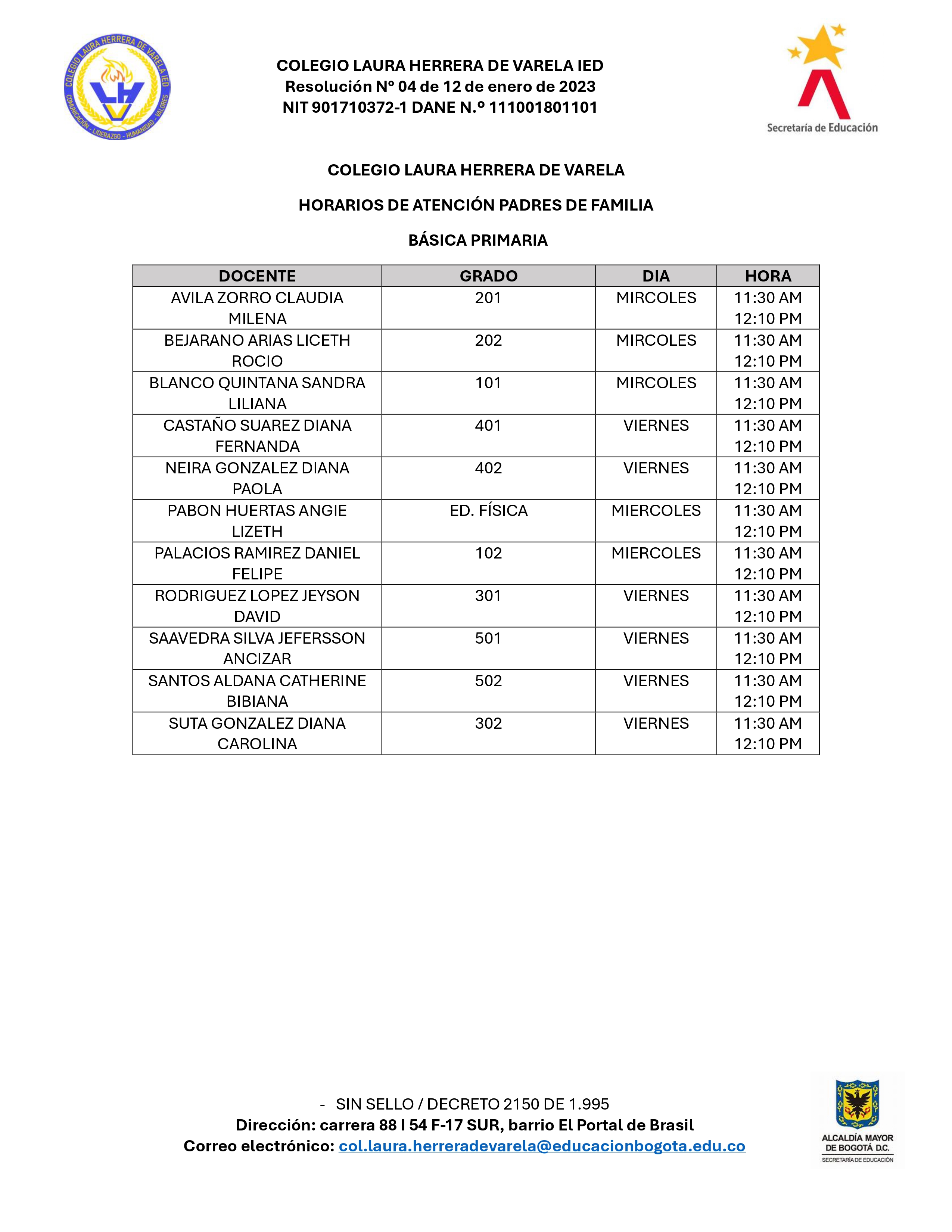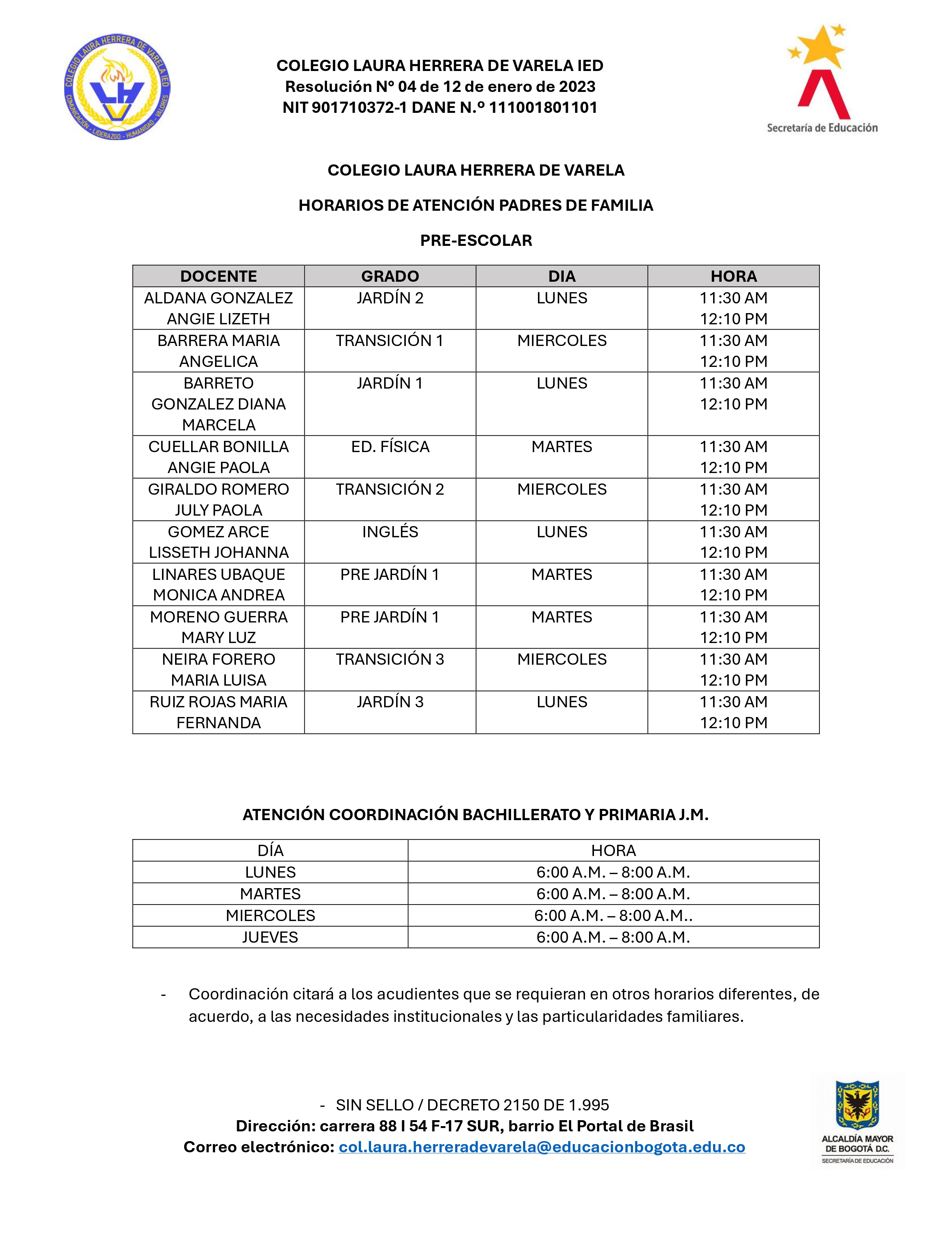 HORARIO DE ATENCIÓN A PADRES DE FAMILIA JORNADA MAÑANA COLEGIO LAURA HERRERA DE VARELA IED Enviado por Ana Patricia D… el 31/03/2025