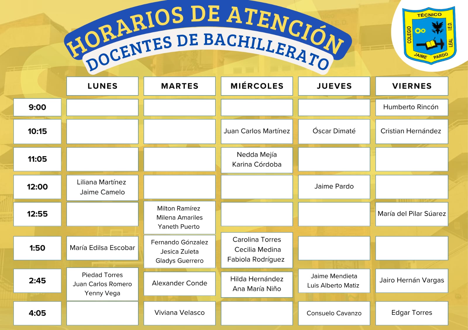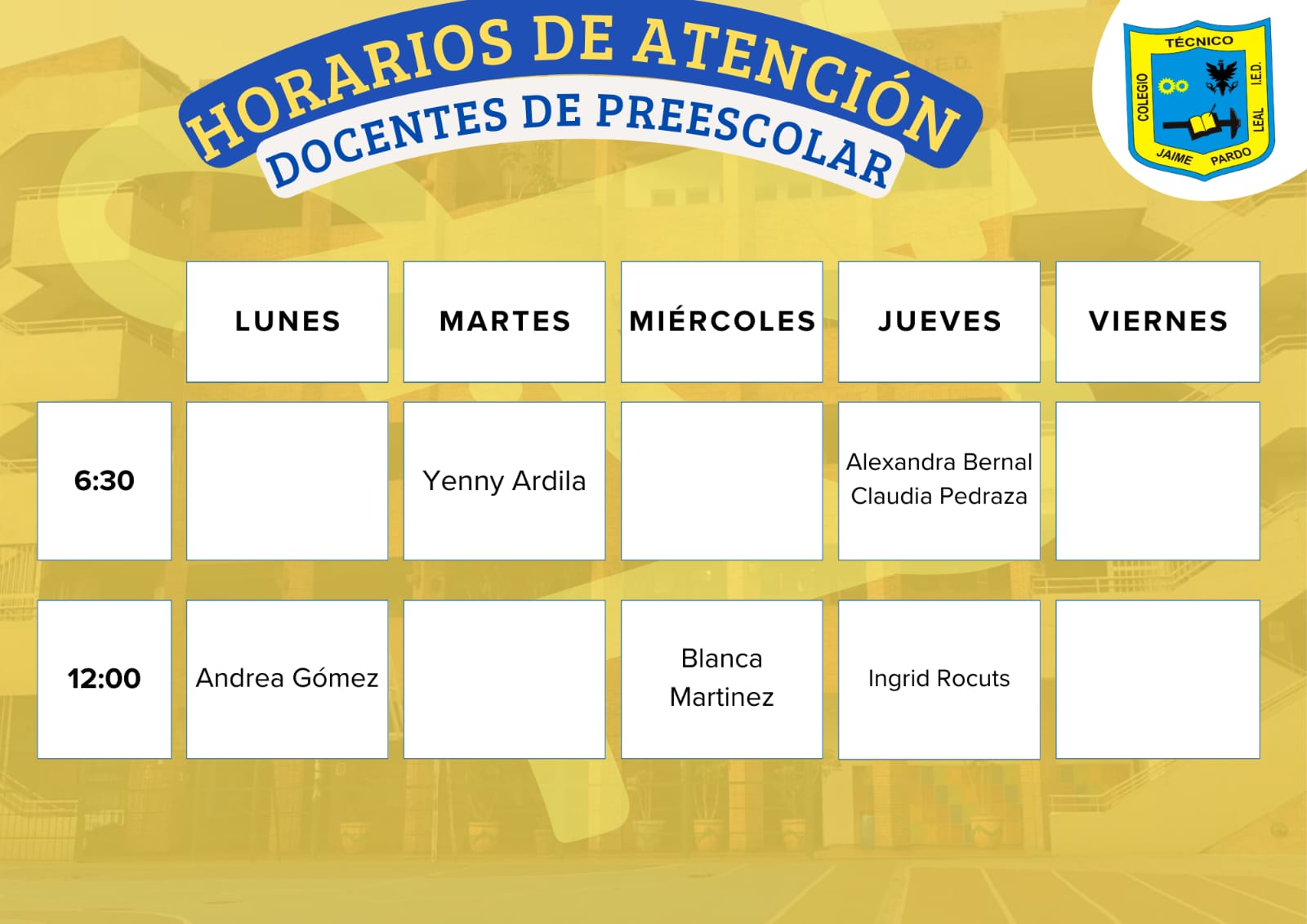 A continuación encontrara los horarios de atención a padres de familia de ambas jornadas, Se recomienda enviar una nota previa a los docentes para agendar cita, ya que, con antelación suelen convocar a otros padres de familia. Esto permitirá que el espacio este disponible para atenderlo adecuadamente.