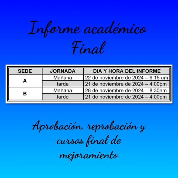 Se recuerda que para el curso final de mejoramiento solo pueden acceder los estudiantes que perdieron una o dos áreas, el cual se realizará del 22 al 27 de noviembre de 2024 y allí definirá su año académico.