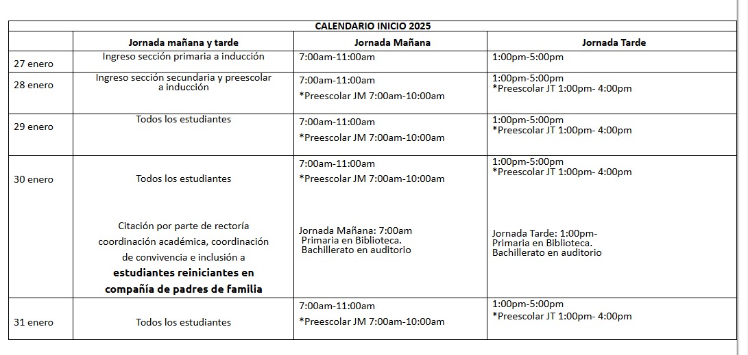 Nos complace informarles que el regreso a clases está programado para el próximo 27 de enero de 2025. Les invitamos a consultar el cronograma de actividades iniciales, donde encontrarán detalles sobre los horarios.