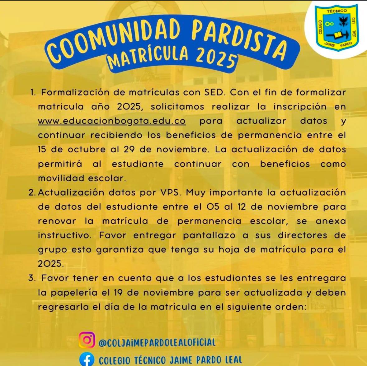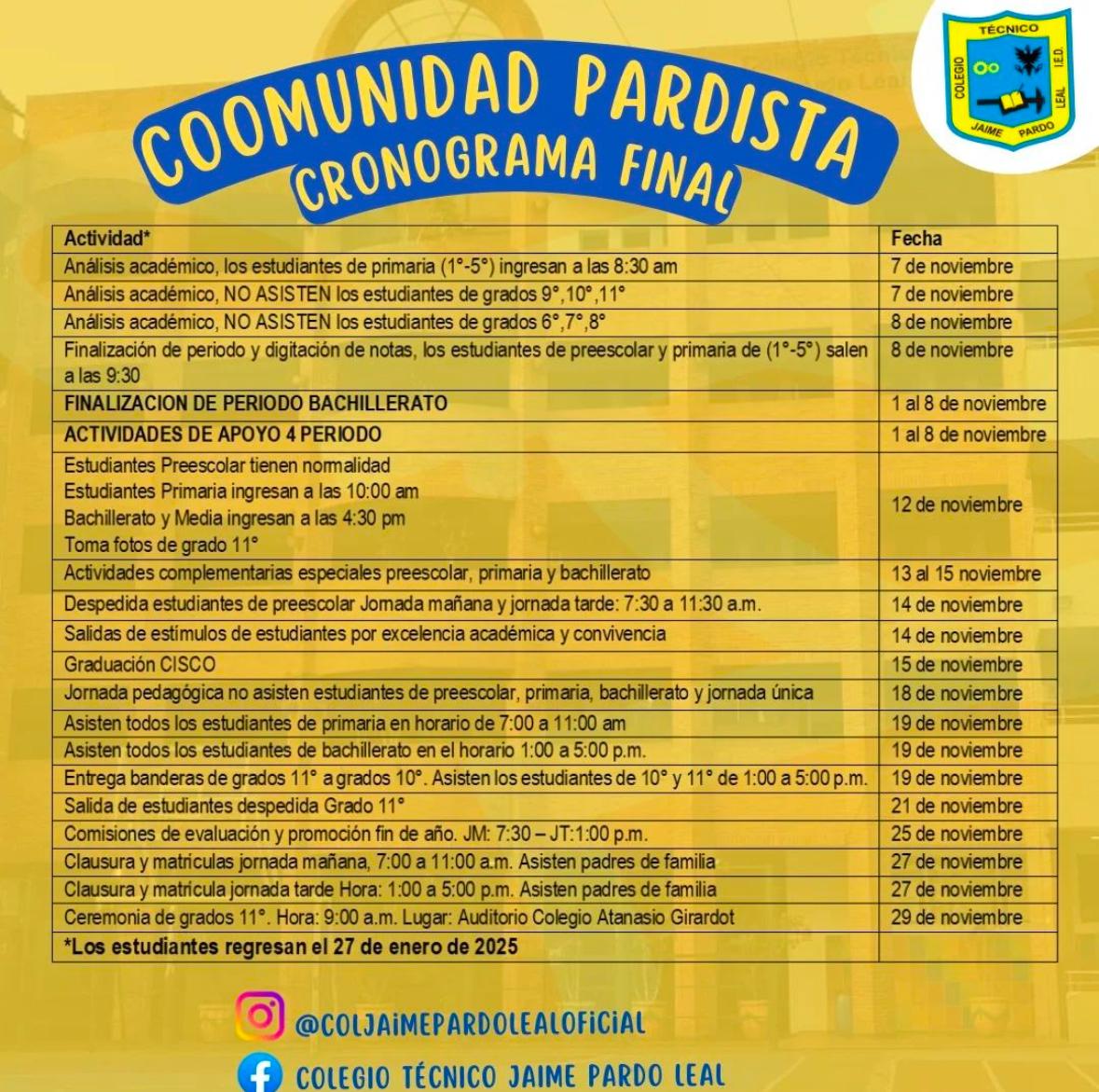 Matriculas y cronograma Finalización COLEGIO TECNICO JAIME PARDO LEAL (IED) Enviado por Ana María Galvis el 10/12/2024 Fechas importantes para tener en cuenta para la finalización del año escolar.