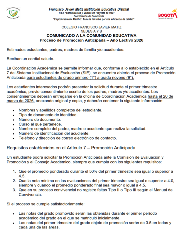 Proceso de promoción anticipada 2026 (únicamente para estudiantes de primero a noveno grados). COLEGIO FRANCISCO JAVIER MATIZ (IED) Enviado por Adriana Alexan… el 28/02/2026
