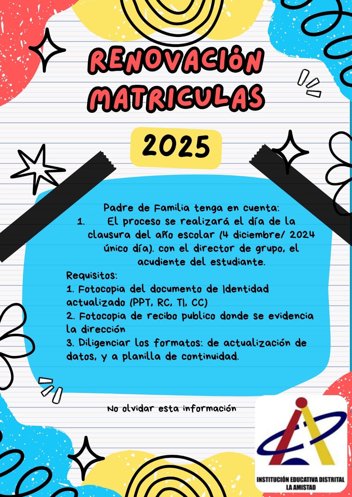 RENOVACIÓN MATRÍCULAS AÑO 2025 Colegio La Amistad (IED) Enviado por Olga Rocio Castro el 20/11/2024