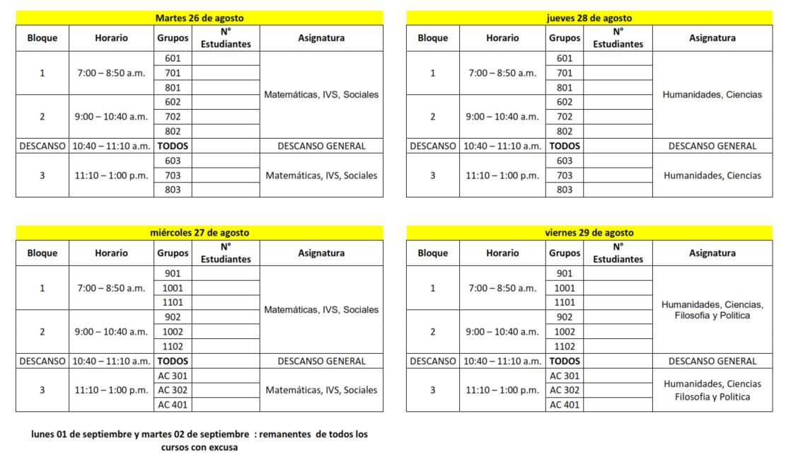 Nos permitimos informar que las evaluaciones digitales por competencias correspondientes al segundo período académico se desarrollarán en la sede A desde el martes 26 de agosto hasta el martes 2 de septiembre, en el horario habitual de clases y de acuerdo con la programación anexa.
