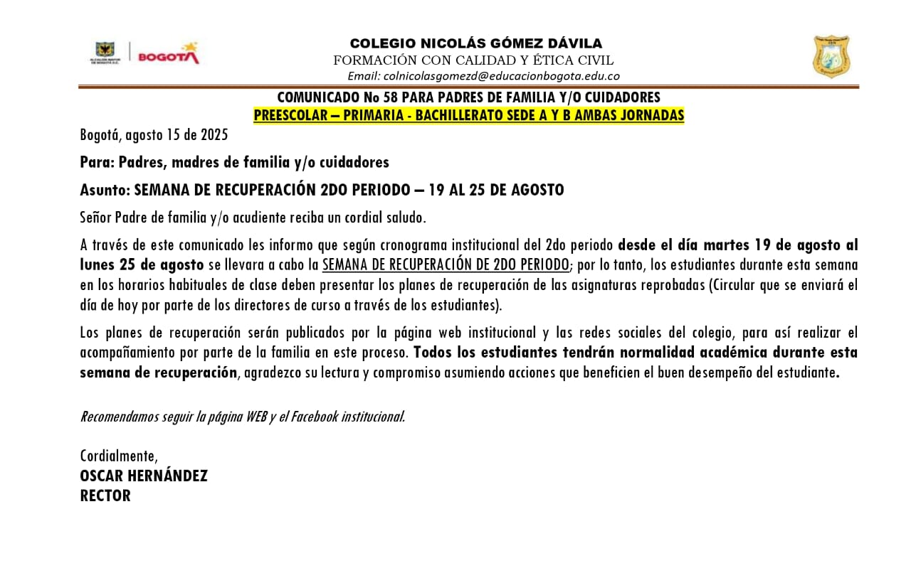 SEMANA DE RECUPERACIÓN 2DO PERIODO – 19 AL 25 DE AGOSTO Colegio Nicolas Gomez Davila (IED) Enviado por Ingrid Lizeth … el 16/08/2025 COMUNICADO No 58 SEMANA DE RECUPERACIÓN 2DO PERIODO