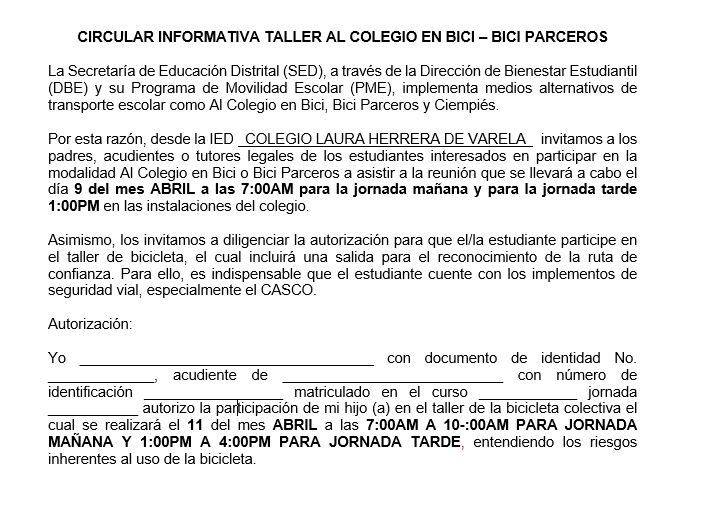 Por esta razón, desde la IED COLEGIO LAURA HERRERA DE VARELA invitamos a los padres, acudientes o tutores legales de los estudiantes interesados en participar en la modalidad Al Colegio en Bici o Bici Parceros a asistir a la reunión que se llevará a cabo el día 9 del mes ABRILa las 7:00AM para la jornada mañana y para la jornada tarde 1:00PMen las instalaciones del colegio.