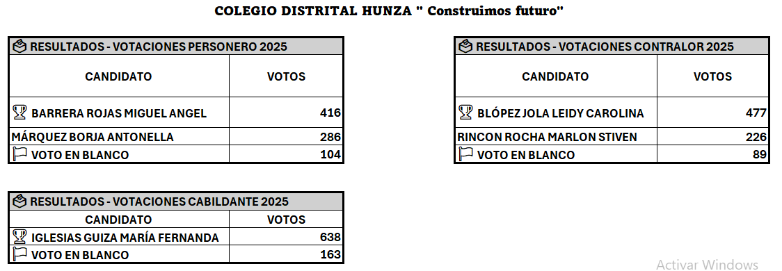 Votaciones-2025 Colegio Hunza (IED) Enviado por Liliana Rojas … el 20/02/2023 Hola, buen día para tod@s. Estos son los resultados de las votaciones 2025.FELICITACIONES A LOS GANADORES